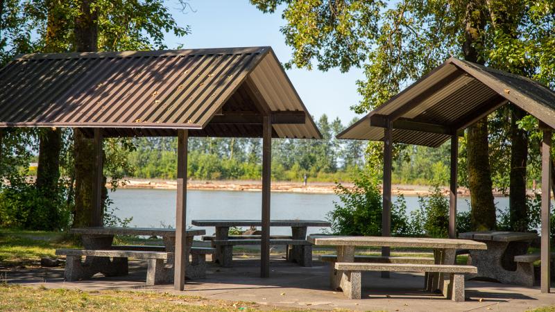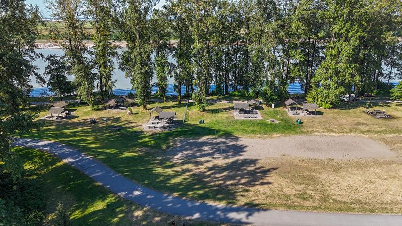 - covered picnic shelters, washrooms, water, two outdoor volleyball courts, trails, and playgrounds