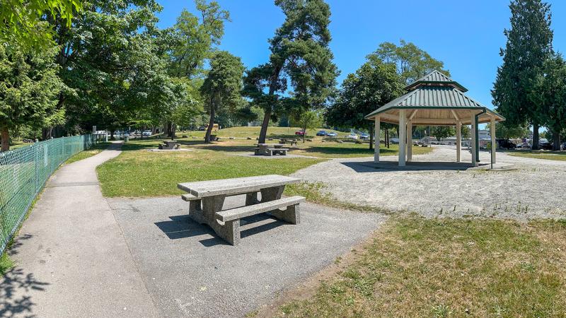 - covered shelters, washrooms, water, bocce courts, lawn bowling, tennis courts, trails, playground, running track, and spray pool (summer only)
