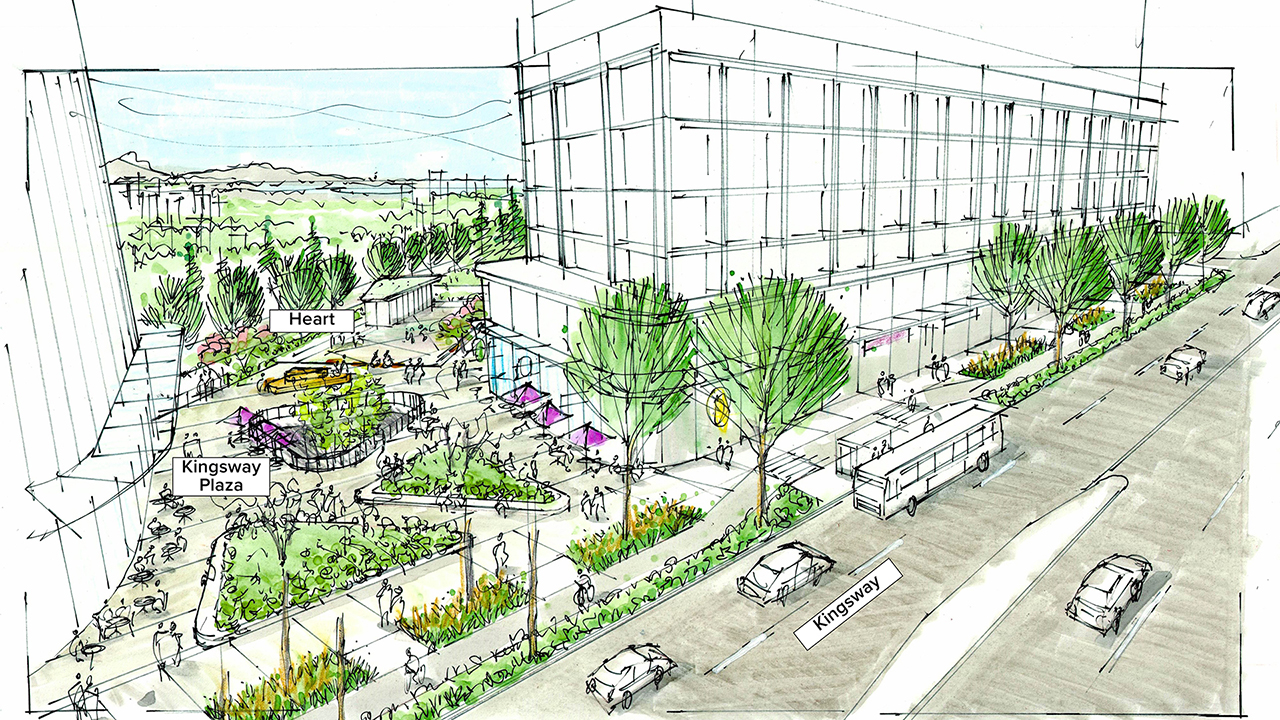 Following public engagement in spring 2023, the Kingsway and Edmonds Conceptual Master Plan advanced for Public Hearing. The conceptual master plan defines the vision and development objectives for the site. The focus is on housing affordability, development flexibility and overall sustainability. Urban design principles were determined based upon the site’s history, community context, important location, and pedestrian and vehicle networks. These aspects informed the “big moves” in the master plan, which focus on enhancing connectivity and movement, delivering a compelling built form, creating a new landmark place and providing an enticing “heart” gathering space.