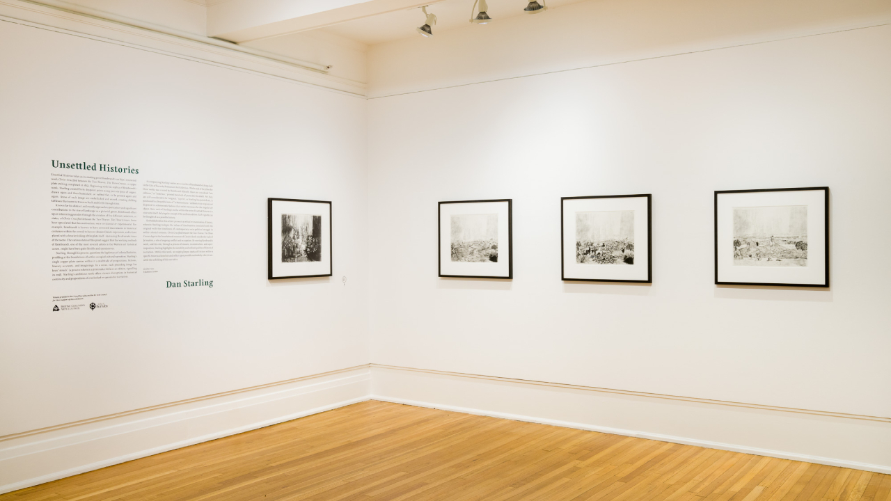 Included in the exhibition are 40 drypoint prints from Dan Starling’s Unsettled Histories series accompanied by a number of Rembrandt etchings held in the City of Burnaby Permanent Art Collection. A cloth-bound hardcover publication featuring essays by Daniel Adleman, Sanem Güvenç, and the artist has been published in conjunction with the exhibition.