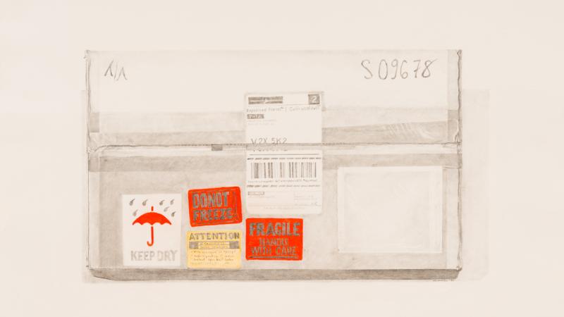 Kristen Krimmel’s careful selection and delicate representation of disposable packaging acknowledges the inherent appealing composition such packaging carries. Over some months, the artist collects a number of worn packages and selects those she chooses to draw deliberately and with acute attention to detail. Although the life of the object may, until the time it meets Krimmel’s doorstep, be subject to much haphazard treatment—tumbling in storage containers and floating along across various conveyers—Krimmel is discerning about which she chooses to draw. Each package has different compositional elements, some more attractive than others. Through a number of drawing mediums and Krimmel’s patience and precision, these compositional elements, such as the contrast between the translucency of packaging tape and the bright font of the directives, come to life. These pensive works become studies on beauty, the mundane, value, and impermanence. Curated by Emily Dundas Oke, BAG Assistant Curator.