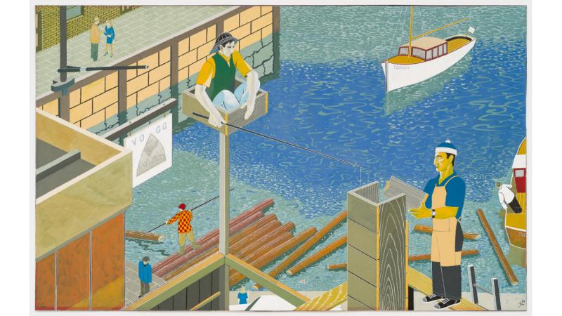 Through painting and drawing, Ackroyd depicted experiences of his day-to-day life infused with imaginative, otherworldly portrayals. The juxtaposition between the mundane, the unexpected, and the surreal in his work results in vivid tableaux that evoke places and cultures sometimes worlds apart. Whimsy appears across Akroyd’s oeuvres, with exquisite attention to details that build up intricate scenes into multiple co-existing storylines.