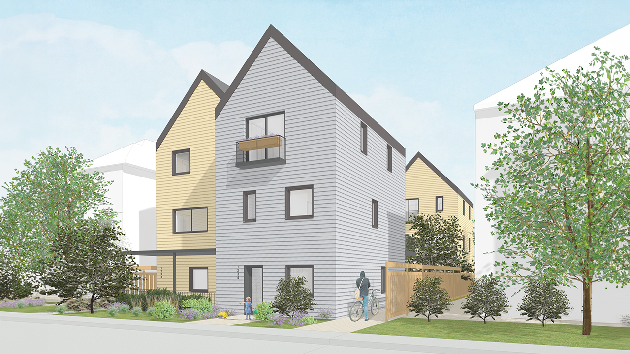 - discrete building volumes that can respond sloped sites by stepping at demising walls.