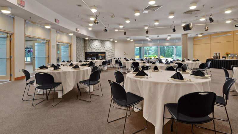The Atrium is the perfect choice for a wide variety of events. It has a gorgeous two-storey cathedral-style ceiling of Douglas fir and stonework walls. The park view lounge has a gas fireplace and stunning views of Deer Lake Park. Twenty-five-foot windows fill the space with natural light.